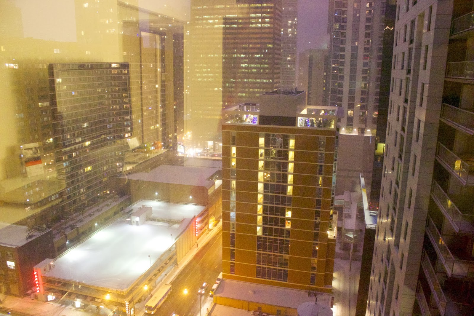 We ended the night in our room, gathered around the TV and drinking raspberry lambic and champagne and trying to find something on TV other than Miley Cyrus. We ended up watching the local countdown and a show on HLN about the top viral videos from each state, which included many a dance and cute animal. It was fun to watch the snow fall and then to see fireworks outside our hotel windows as well. I also participated in some kind of flashlight code with the kids staying across the way; they were flashing the flashlights on their cell phones out their windows at midnight, so I flashed mine back, and they waved and waved. It was exciting to be in a big city for NYE! Yet, quickly after midnight, Zach's parents retired to their room, we finished the champagne, and then we headed off to our first sleep of 2014! 2013 was tiring.